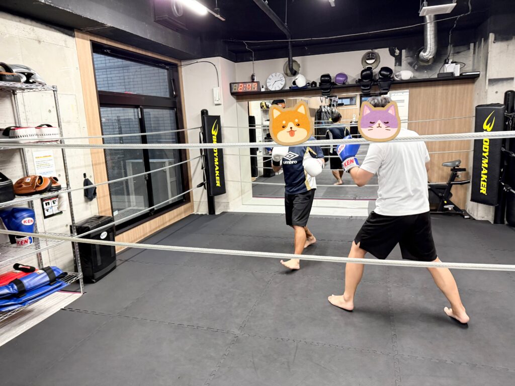 相手も来ないので帰ろうと外に出た瞬間ちょうど入れ替わりで試合出場希望の会員さんが来られたので「スパーしませんか?」とお声掛けして再度ジムに入り、マススパーリングからの2回目のタバタ式。